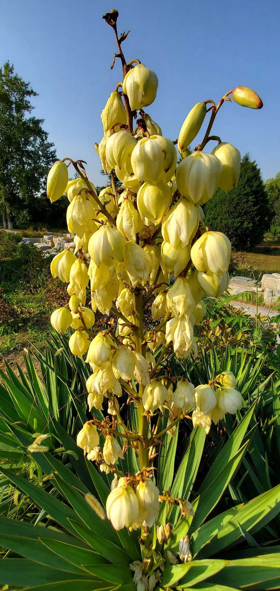介绍:花莛高1米~2米,大型圆锥花序,有花多朵;花白色至乳黄色,顶端常带紫红色,下垂,钟形,花被6片,卵状菱形;花期7月~9月。由于其巨大的花序十分引人注目,很受人们欢迎。是萨尔瓦多的国花。常在公园花坛中种植。在华北地区种植需稍加保护方能越冬。喜疏松、排水良好的砂质壤土和充足的阳光。生长势强健,栽培甚易。通常用分株和播种法繁殖。由于其叶片尖部为硬刺,易伤人,不宜家庭中种植。