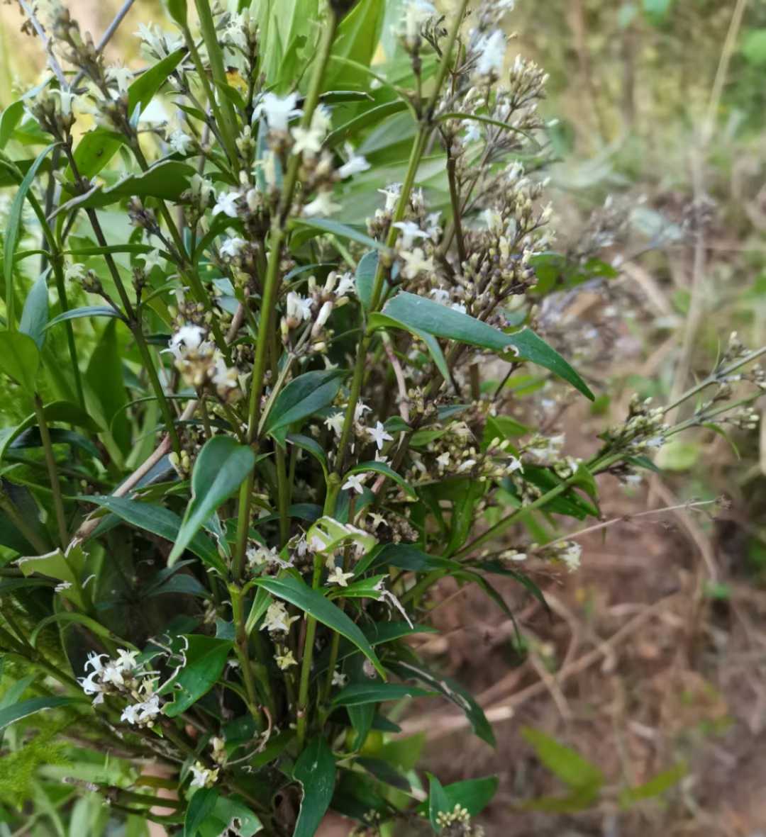 介绍:直立分枝的灌木状草本。茎圆柱形,上部近四棱形。叶对生;叶柄长2-7(-10)mm,稍粗壮;叶片革质,披针形,长4-10cm,宽2-2.5cm,先端渐尖或长尖,基部楔形或稍下延,侧脉2-3对,两面光滑无毛。聚伞花序三歧分枝,圆锥花序式排列,顶生或生于上部叶腋;苞片披针形;花序中央的花无梗,两侧的有短梗;萼简陀螺状,长3mm,裂片卵状三角形,与萼简等长;花冠白色或淡紫色,漏斗状,长6-10mm,裂片披针形,长2-2.5mm;雄蕊伸出。蒴果椭圆形,长4mm,有宿存的萼裂片,两瓣裂。