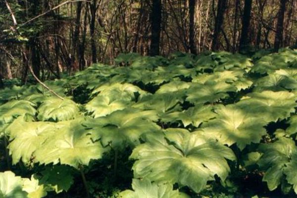 介绍:山荷叶属为多年生草本,有匍匐状、粗厚、具节的根茎;根生叶1枚,大,盾状,分裂,生于粗厚的柄上其状如伞,花茎亦具同形,互生的叶2枚,但较小,叶柄盾状着生于近边缘;花白色,为一顶生的聚伞花序;萼片6,早落;花瓣和雄蕊均6枚;子房上位,由1心皮组成;胚珠5-6颗;浆果球形,有种子数颗。