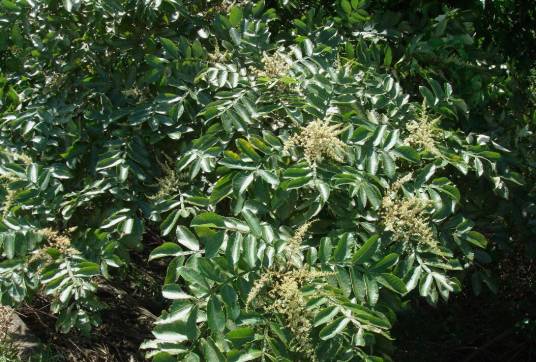 介绍:盐麸木(学名:Rhus chinensis Mill.),漆树科盐麸木属落叶小乔木植物。高达10米,小枝棕褐色,叶片多形,基部圆形,叶面暗绿色,叶背粉绿色,无柄。圆锥花序宽大,多分枝,雌花序较短,密柔毛;苞片花白色,花瓣长圆形,开花时外卷;核果球形,成熟时红色。8—9月开花,10月结果。盐麸木可以吸收土壤中的盐分,并将其以盐水的形式分泌出,待水分蒸发,盐分附着于树体上,因此得名。 盐麸木为广布物种,现分布于印度、日本等国。在中国除东北、内蒙古和新疆外,其余省区均有分布。喜光、喜温暖湿润气候,适应性强,耐寒。对土壤要求不严。生于中高海拔的向阳山坡、沟谷等疏林或灌丛中。盐麸木有种子繁殖和压根、扦插方式。《日华子诸家本草》《本草纲目》记载盐麸木可“生津降火,化痰,润肺滋肾,消毒,止痢收汗”。盐麸木鲜嫩茎叶中富含氮、磷酸等,且茎叶柔软多汁易腐烂分解,是一种很好的绿肥。另外,盐麸木的嫩茎叶可作为野生