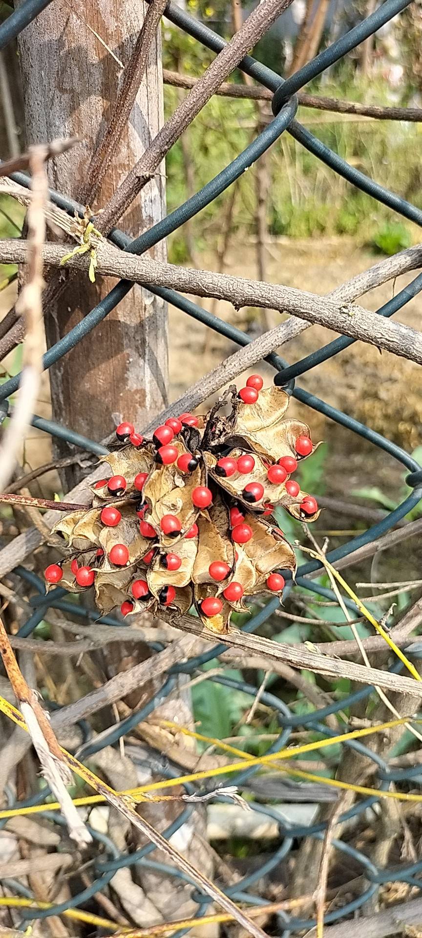 荚果长圆形,果瓣革质,长2-3.5厘米,宽0.5-1.5厘米,成熟时开裂,有种子2-6粒;种子椭圆形,平滑具光泽,上部约三分之二为鲜红色,下部三分之一为黑色。花期3-6月,果期9-10月。