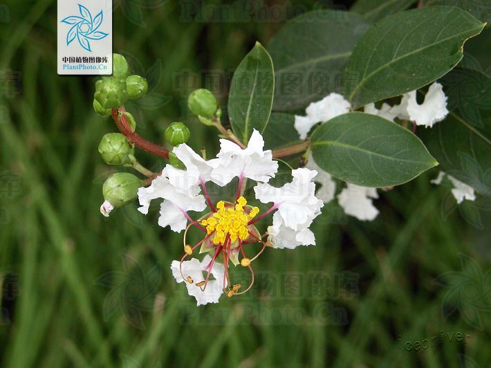 介绍:千屈菜科紫薇属,花白色或微带淡堇色;叶色淡绿。
