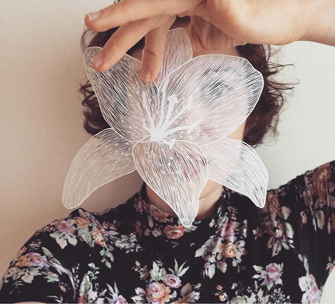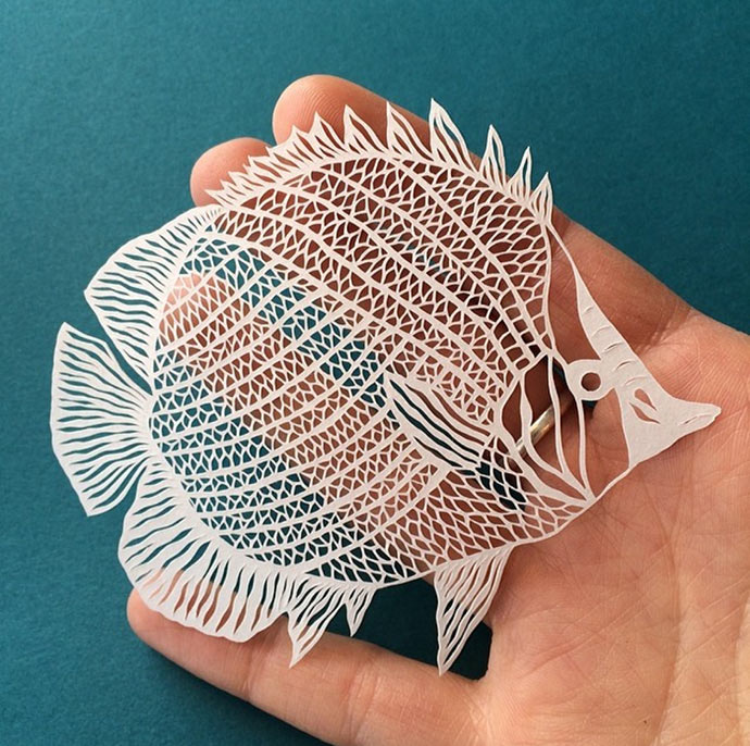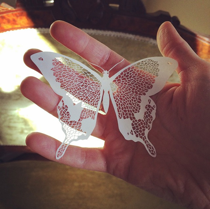她用白纸精心雕刻成花朵、羽毛、各式各样的动物,让大家看到二维空间下的纸雕工艺品也可以这样!