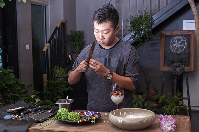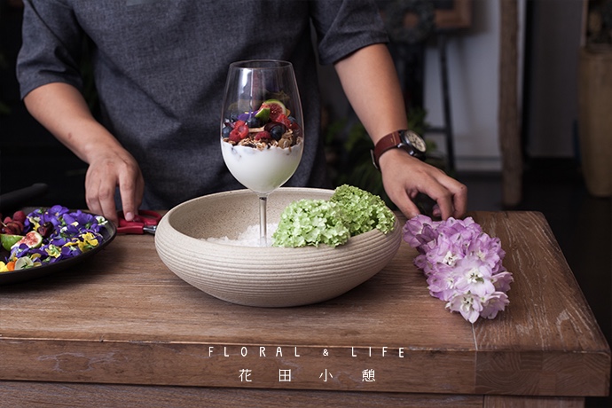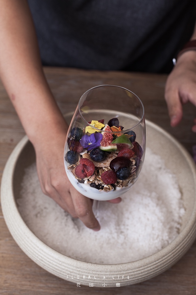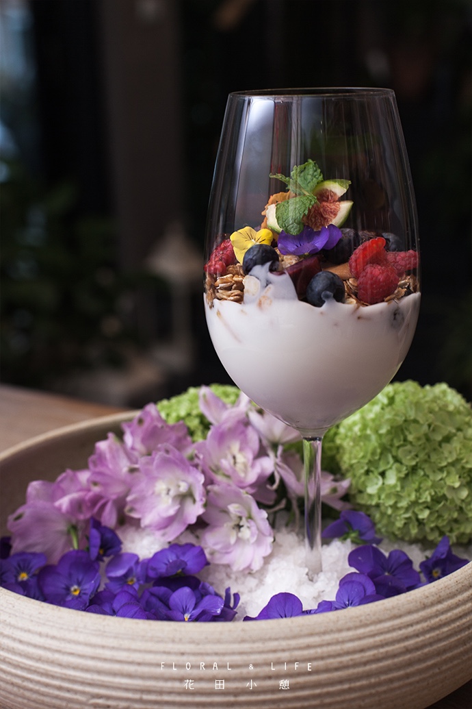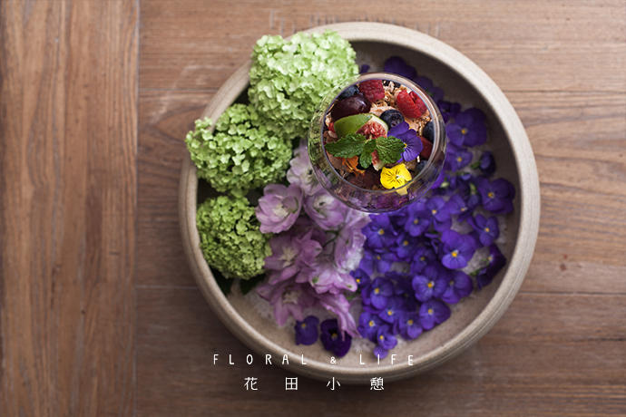 放入2-3瓣三色堇作为点缀,让食物与花朵相互映衬,然后把高脚杯放入器皿中央。