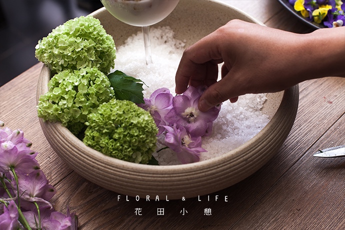 准备好的木绣球剪去枝干,并排放入器皿中的一侧。
