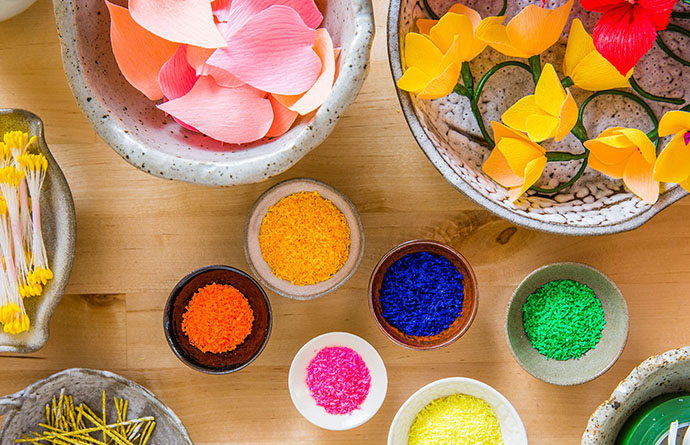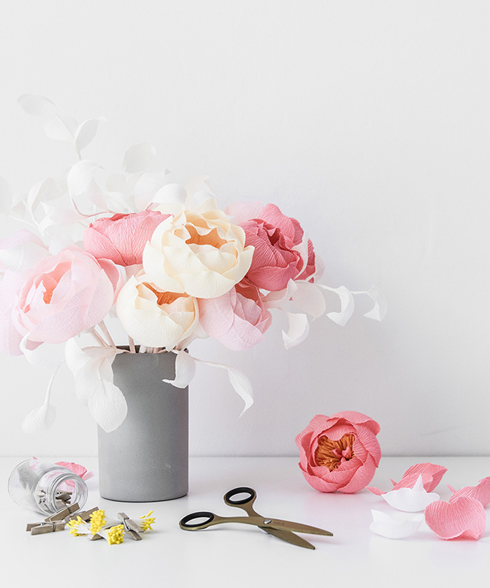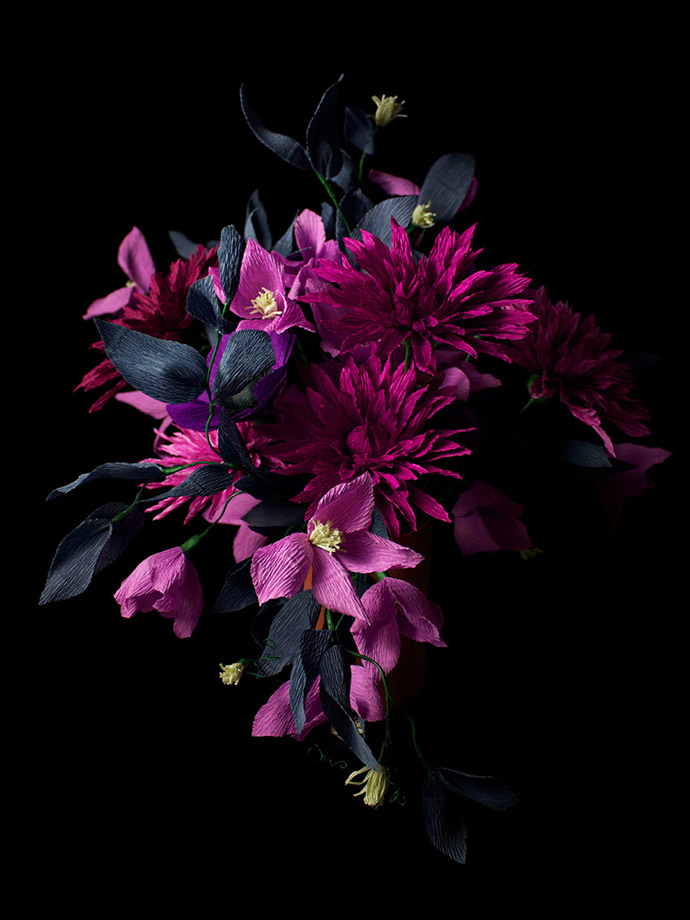 Jennifer的纸质花艺作品使用的是皱纹纸,一般在制作前会首先确定配色,然后手工剪切每一个单独的组建,Jennifer通常不会使用模板,所以每一片花瓣都是独一无二的,做出来的作品就更加自然。根据作品的大小和复杂程度,每朵花需要花费30分钟到3周之久的时间。