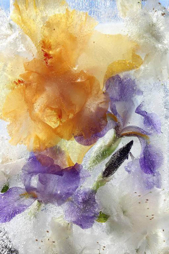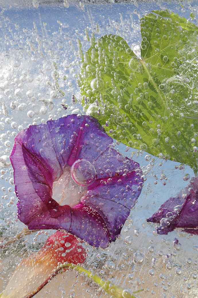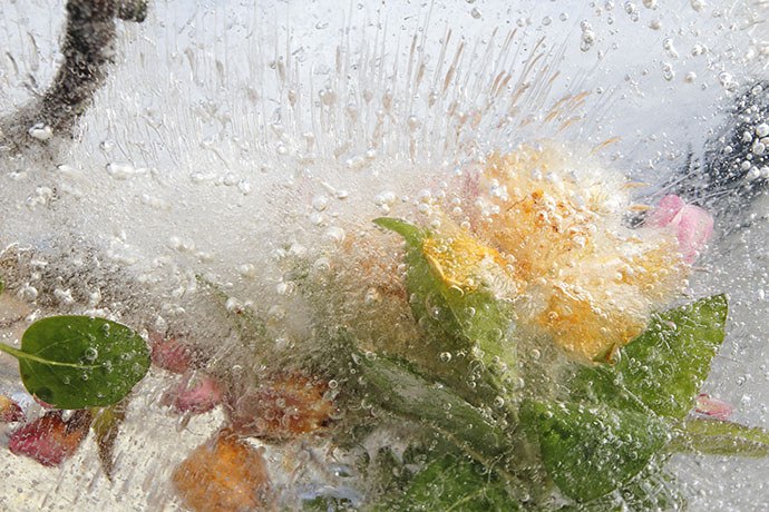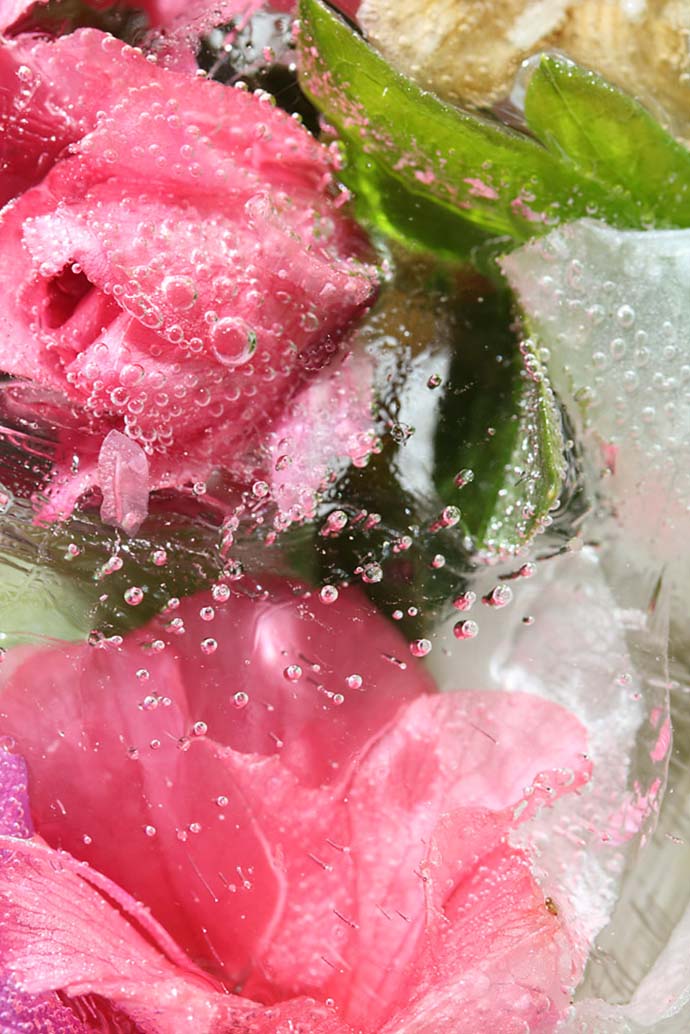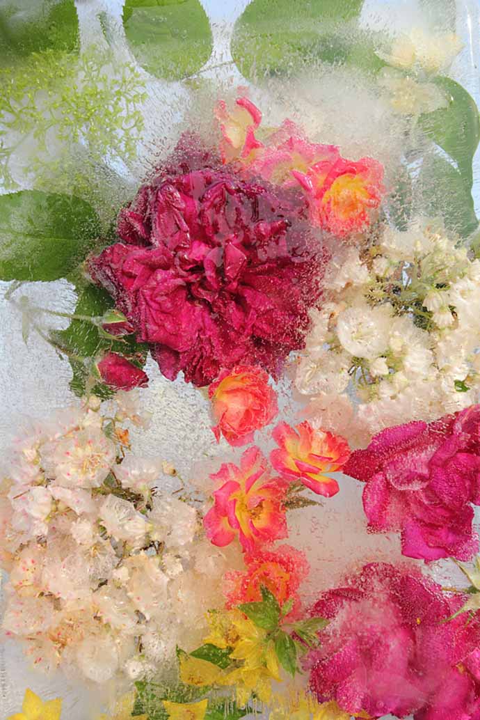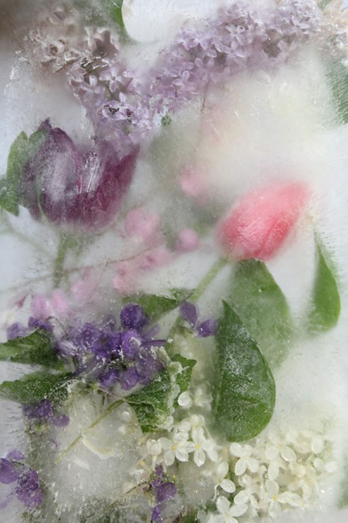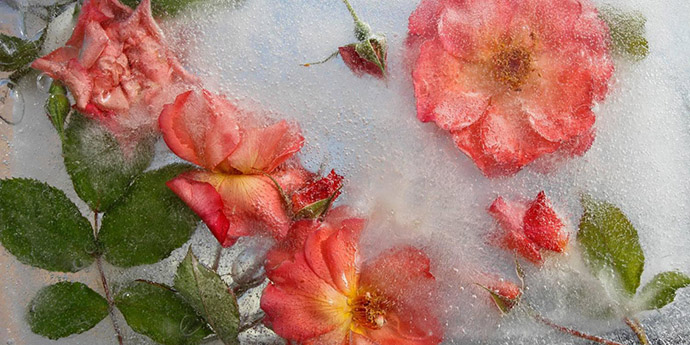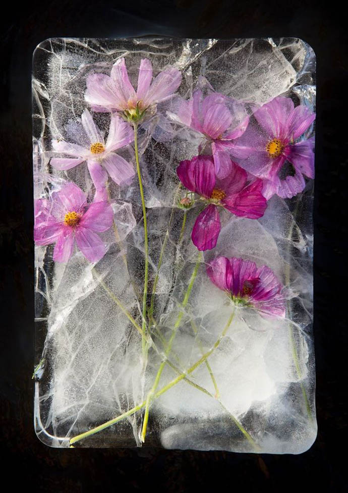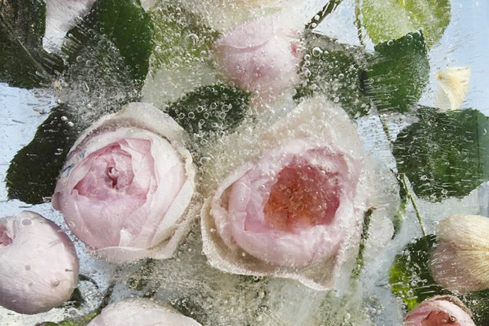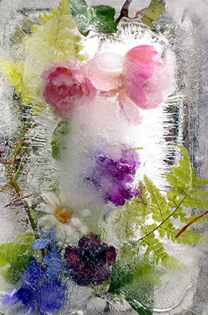 任何事物与冰的接触,大多为了降温或保鲜。鲜花之美如此短暂易逝,艺术家们开始尝试将它们与冰结合,打造鲜花的冰冻艺术品。鲜花们一张张鲜活的面孔,生动的姿态,被定格在了透明的冰块中。