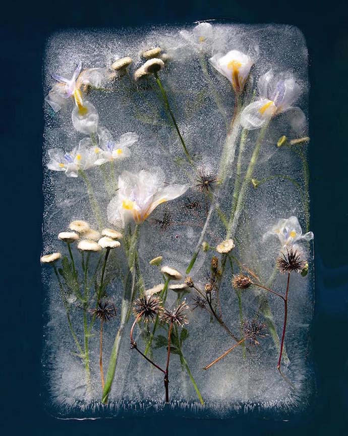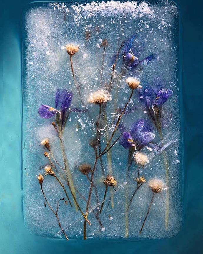 摄影师Mary Kocol,从朋友、家人和自己的花园里挑选新鲜的花材,将它们放入水中、冰冻,制成鲜花冰片,在阳光下进行拍摄,从而创造出了充满想象力的空灵的摄影作品——冰冻花园(Ice Garden)。
