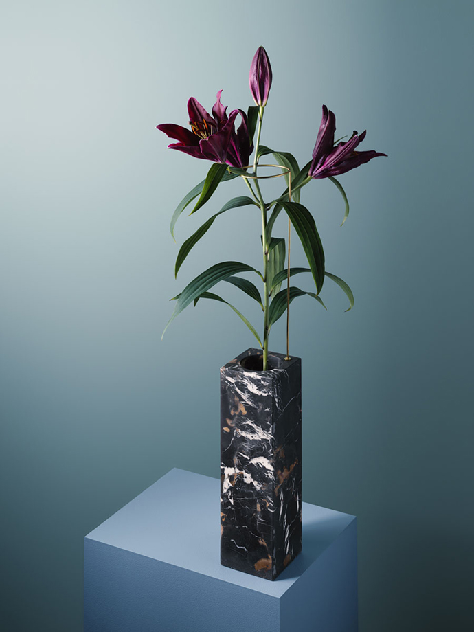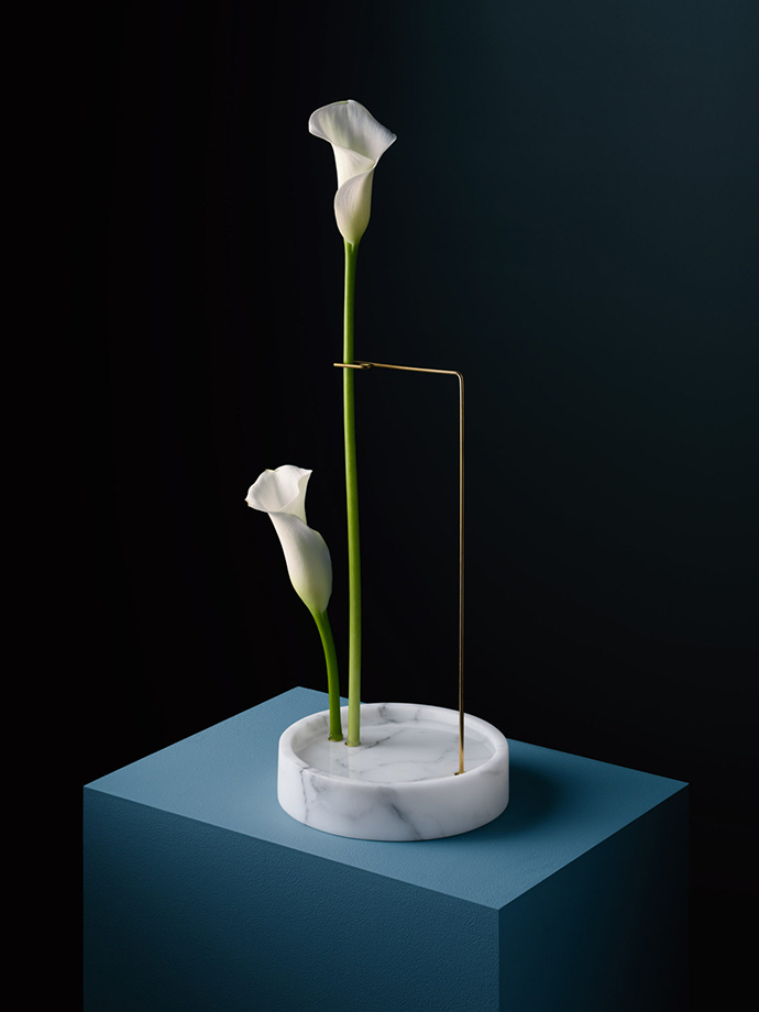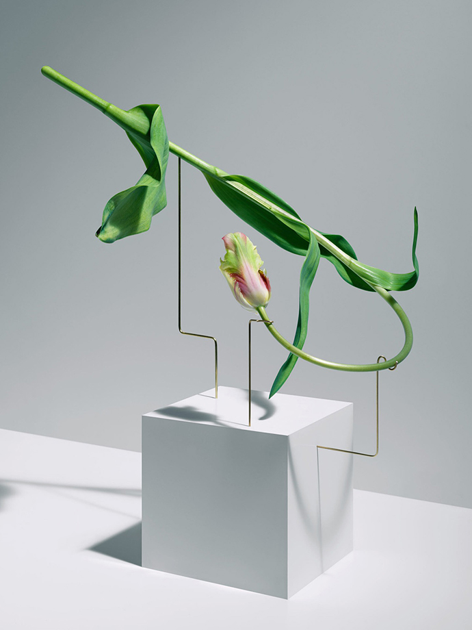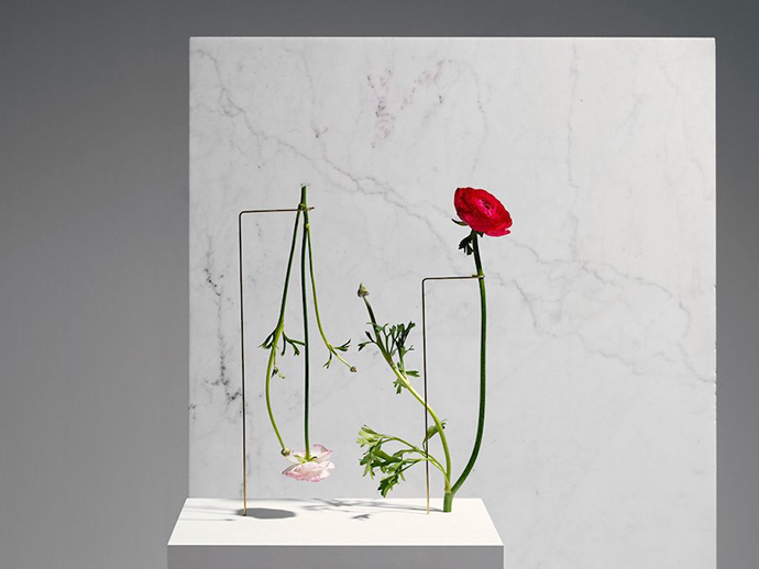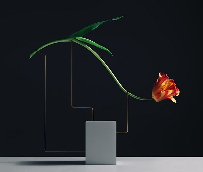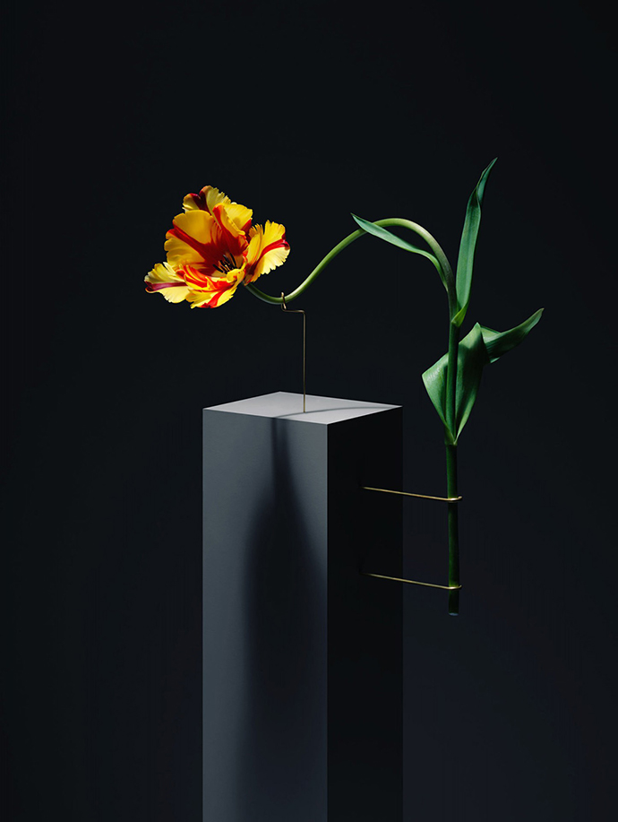 在这组作品中,花器被简化成一个简单的大理石底座,由金属线条支撑花茎,金属线条可以调整成不同的角度和位置,从而控制花朵的姿态,并且让观众欣赏到这一朵花的全部。