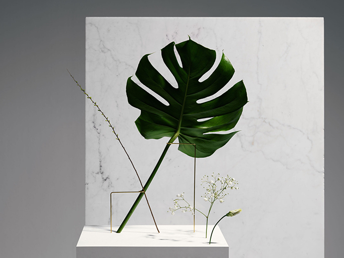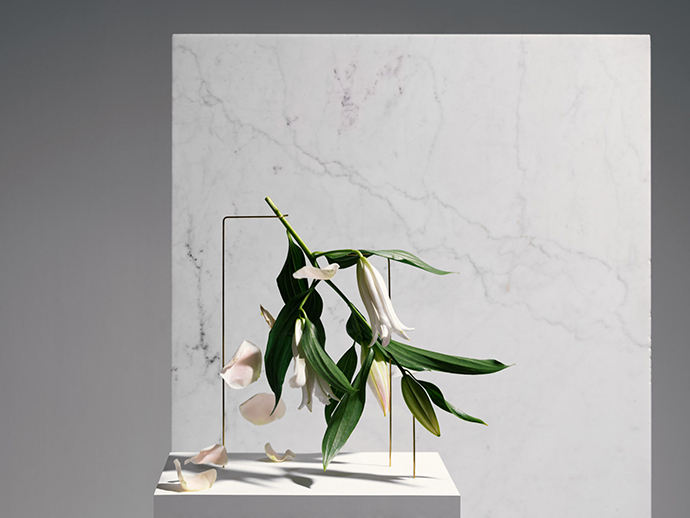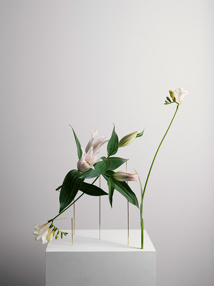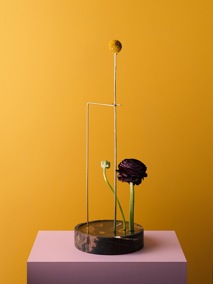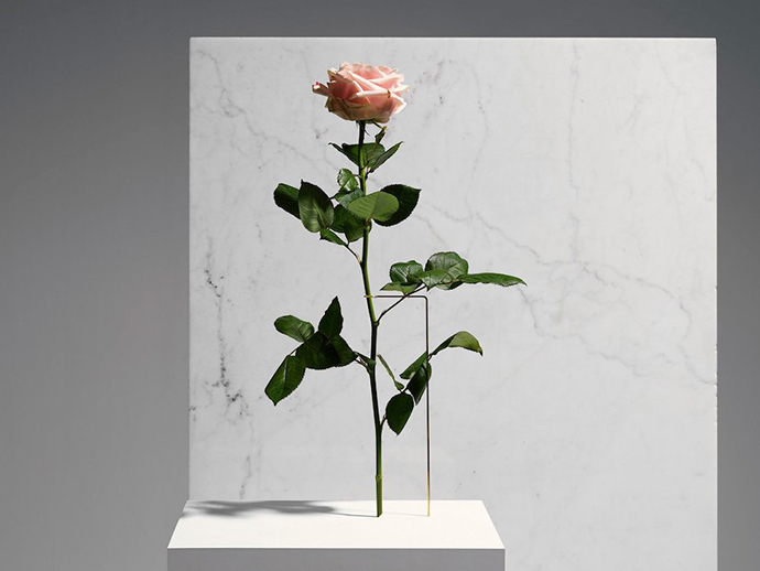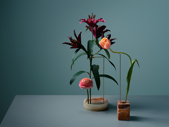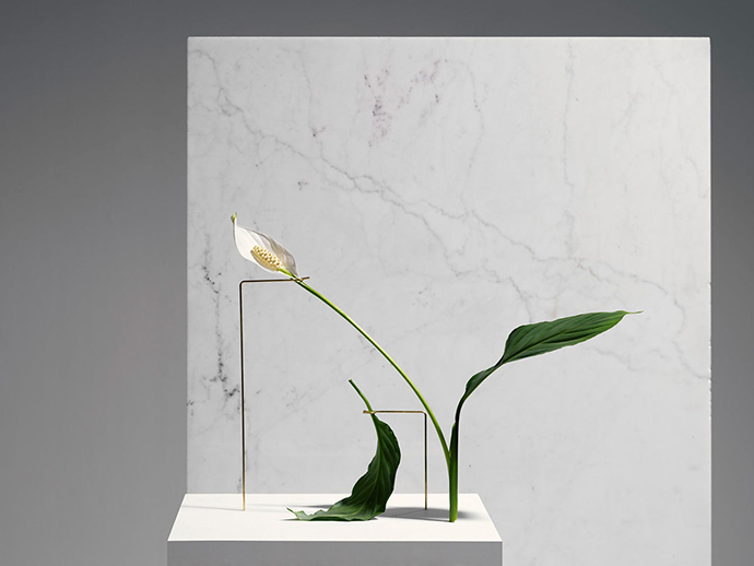 在这组作品中,花器被简化成一个简单的大理石底座,由金属线条支撑花茎,金属线条可以调整成不同的角度和位置,从而控制花朵的姿态,并且让观众欣赏到这一朵花的全部。