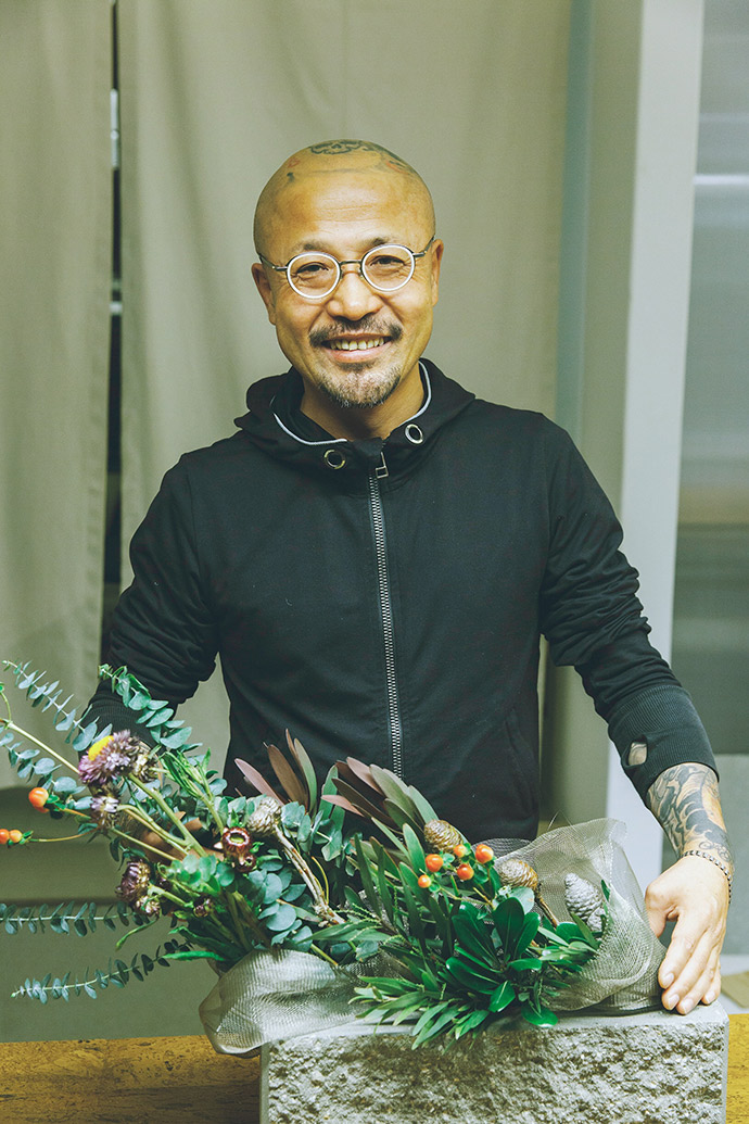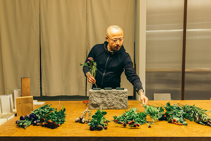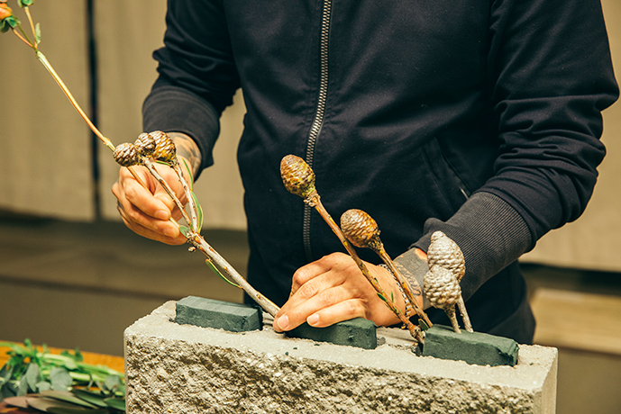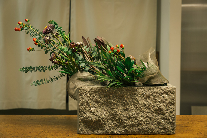— 这次插花选用的花器是建筑中常用到的空心混凝土砖,这种材质是利用混凝土废料,搅拌压缩后制成。冷延明老师希望通过这种回收再利用的建材,表达出一种朴素的环保理念。