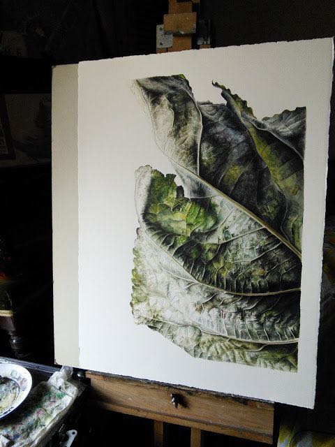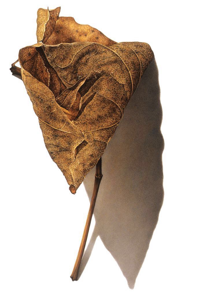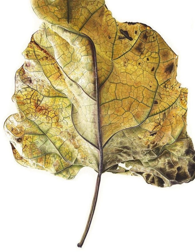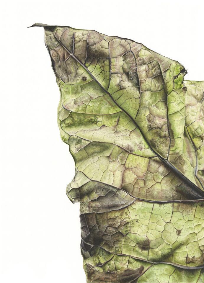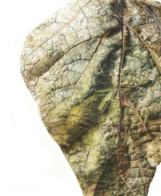 的笔下水彩树叶画幅都很大,最大甚至超过一米,不过也正是这样超常规的尺度让我们能发现到一片不起眼落叶的美,感悟到,时光从生命中流逝的样子。