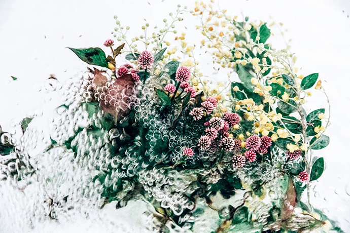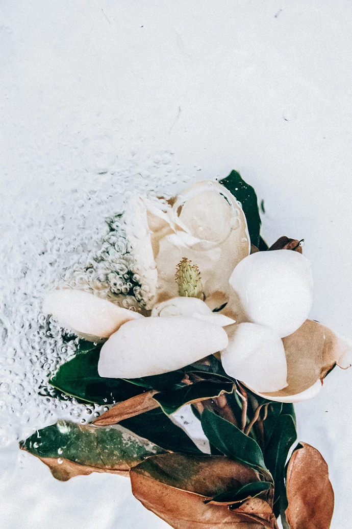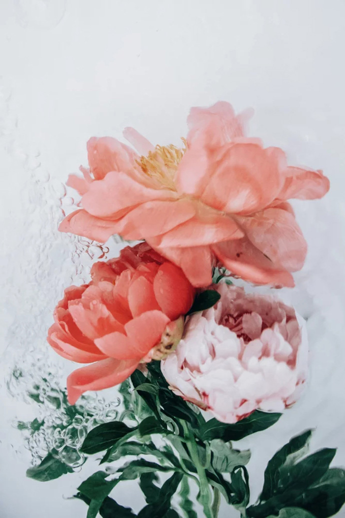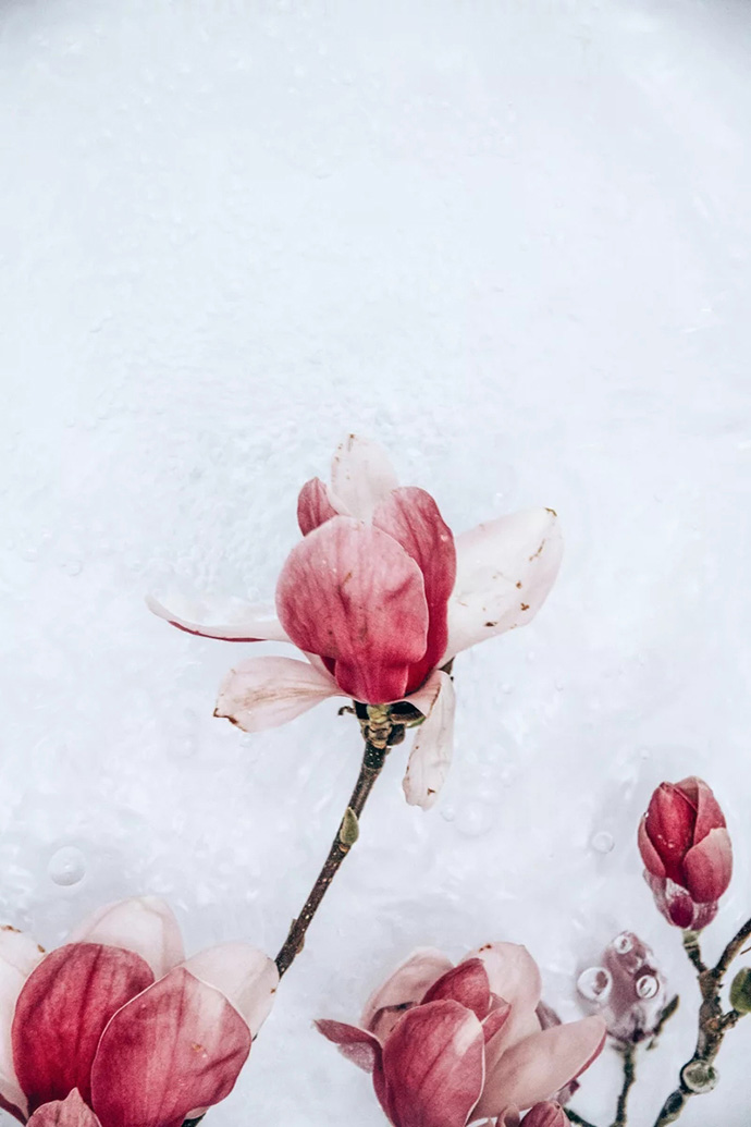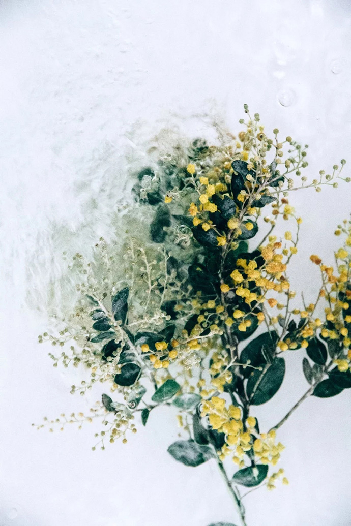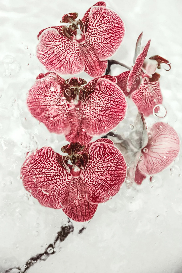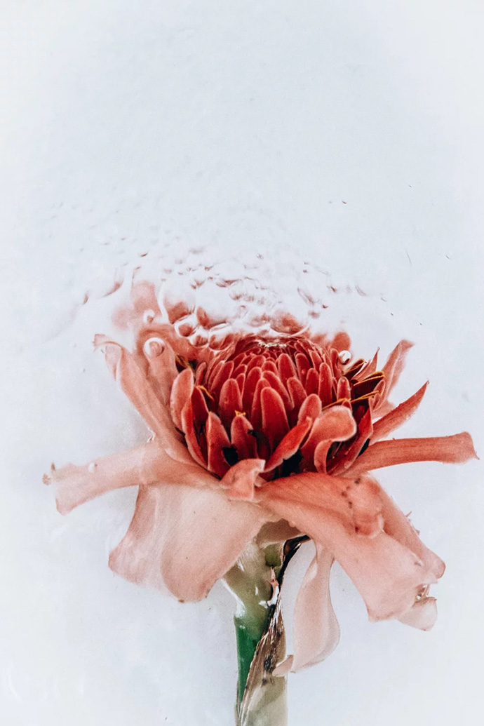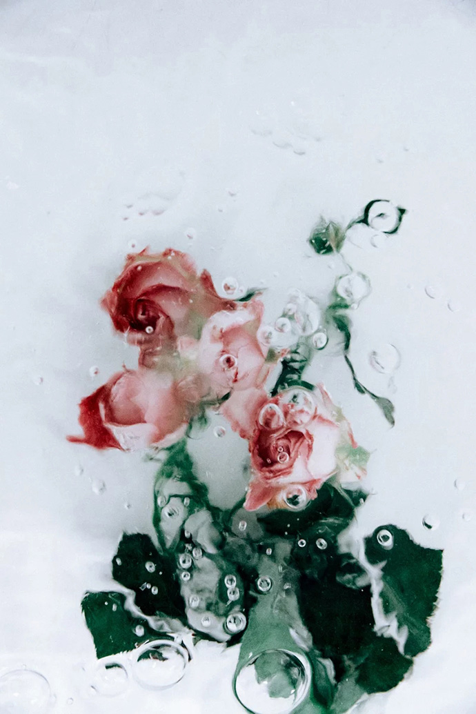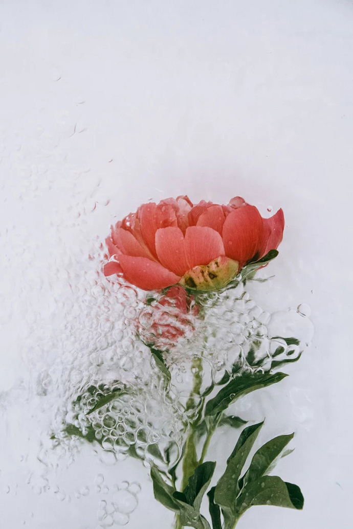 鲜花进入水中的瞬间会携带大量的气泡,这些气泡成为画面中独特的组成部分,让花朵显得更加洁净轻盈,画面也更加动感。