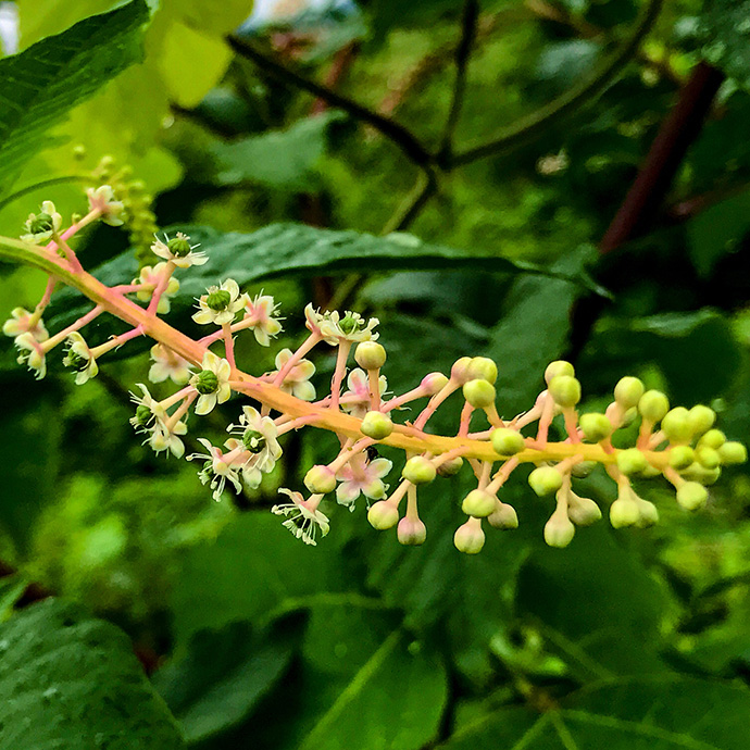 五月的花市中经常能看到商陆,其实它的学名叫垂序商陆,也叫北美商陆,这种植物从美洲引进中国,和五叶地锦一样,其实是外来入侵物种,春夏季节也就是常见的绿色的小商陆,可以用来插花使用,但入秋后,商陆变成紫红色就是有毒物种啦,所以以后秋季见到紫红色商陆别当小果果吃哈。