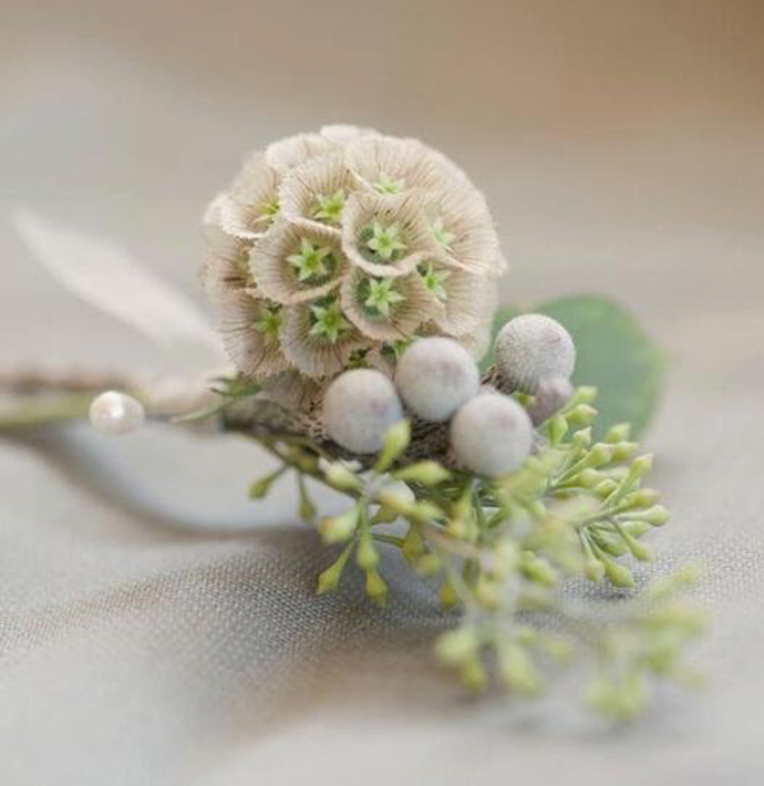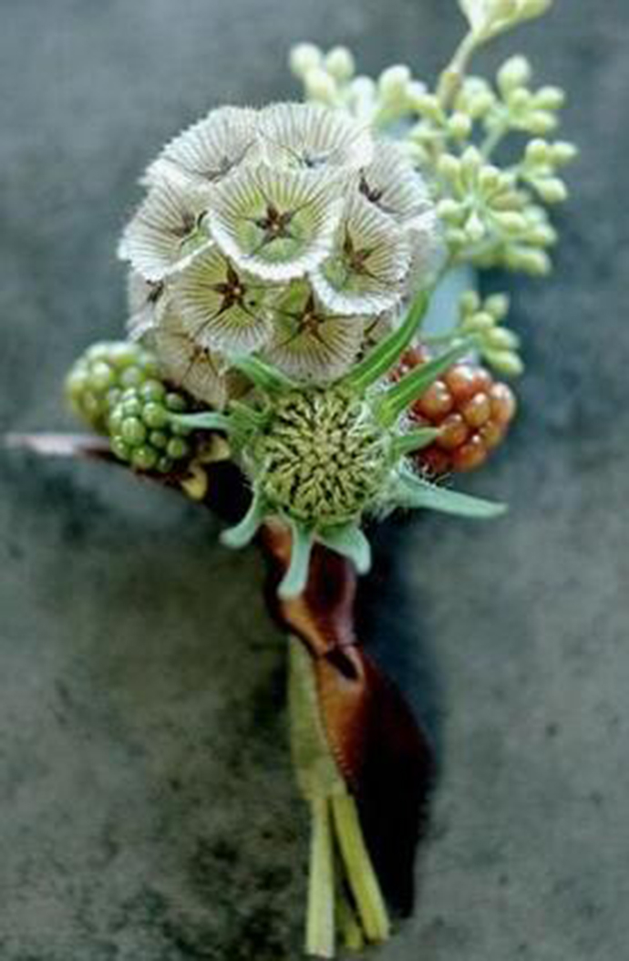 唐棉果的果实十分特别,为黄绿色卵圆形或椭圆形果泡,看似绵软,样似气球,果表有粗毛,似用钉子锤入,因此又称气球果、钉头果。作为配草,它形态可爱俏皮,不经意间就为整体花束增添了几分乐趣。