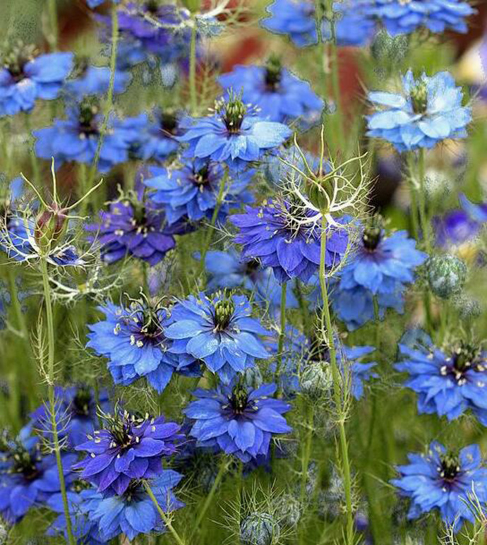 黑种草约 1 到 2 英尺高,长着带花边的绿色叶子,开的花多为白色或蓝色。蓝紫色的花朵点缀于绿色刺状的草叶间,让人想起格林童话里夏夜的精灵,灵动可爱,唤起人们的少女心。