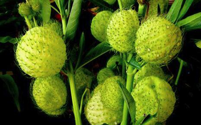 唐棉果的果实十分特别,为黄绿色卵圆形或椭圆形果泡,看似绵软,样似气球,果表有粗毛,似用钉子锤入,因此又称气球果、钉头果。
