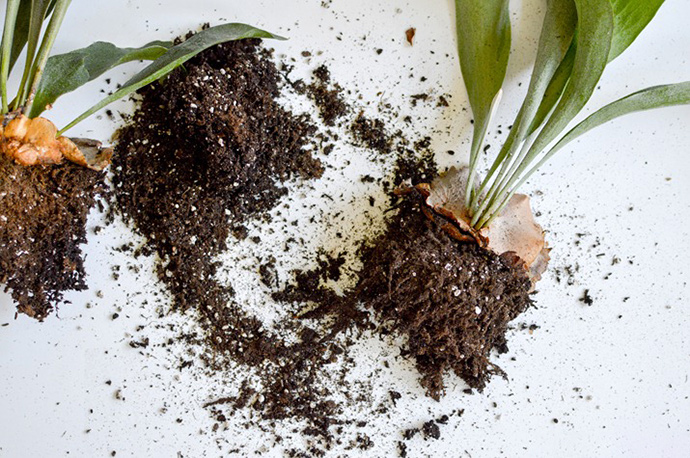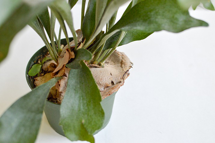 从盆里移出鹿角蕨,轻轻将土壤基质去掉,移栽到木板上。此过程最主要是确保根部完整。
