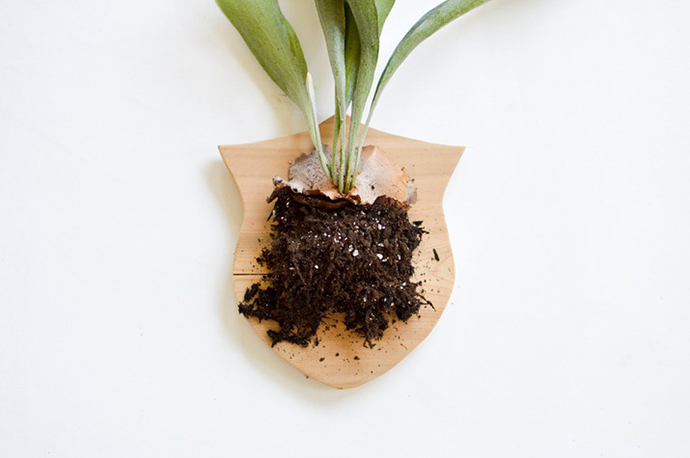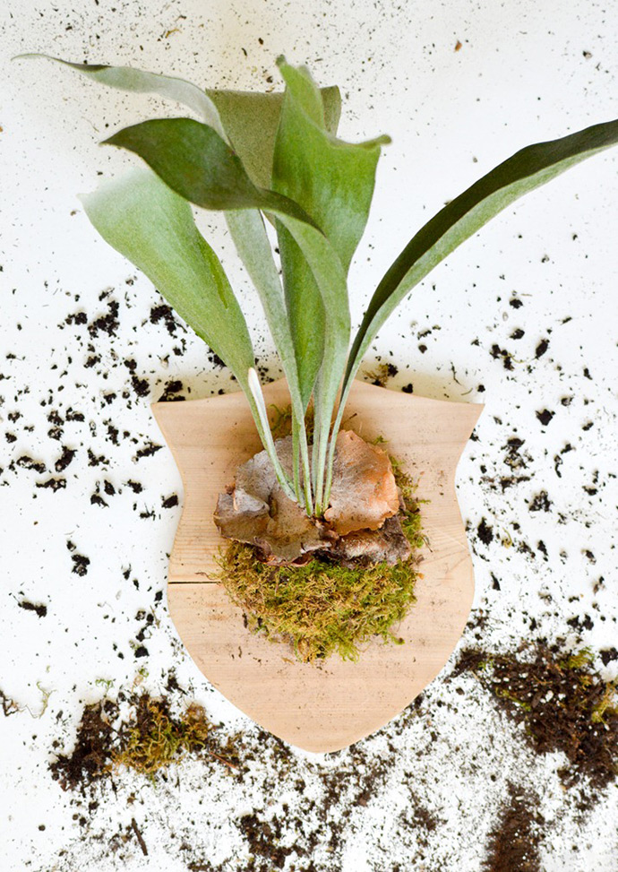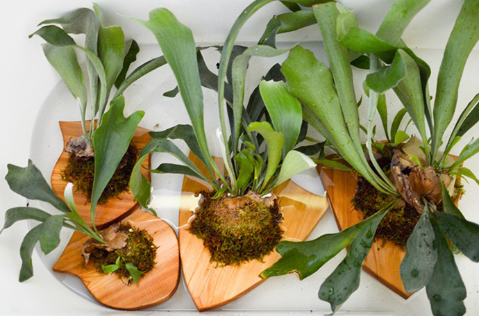 完成之后直接挂到墙上观赏即可,尽量避免用手触摸鹿角蕨的叶片,否则叶面的白色绒毛易脱落影响美观。
