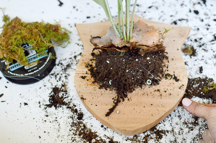 用苔藓包裹好鹿角蕨根部,丝线扎紧。在安装鹿角蕨时,需要把无菌叶露在外面,而且不要正对木板,否则植物生长时就会向上生长,而不是向外散射。