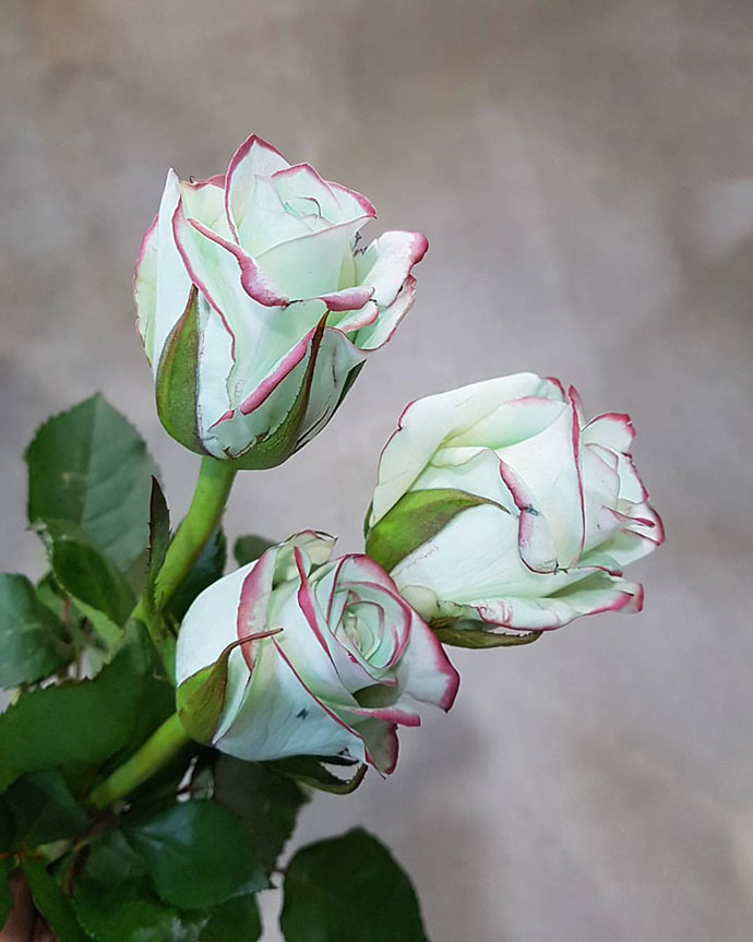 谁能告诉我这花怎么造出来的吗?实话告诉你,这是染色玫瑰,具体的讲,此花是经过浸泡染色剂,它的枝条内部输导组织吸收染液以后得来的,包括国内七彩玫瑰也是同样的流程,但是国内的七彩玫瑰一般是用芬德拉玫瑰来做,上色效果均匀清澈一些,进口的这个玫瑰我就不知道人家国外是用哪个品种做的了,可以问问进口花商,不过你只用知道这个玫瑰是染色的就行,别误导客人,这不是天然的色彩。