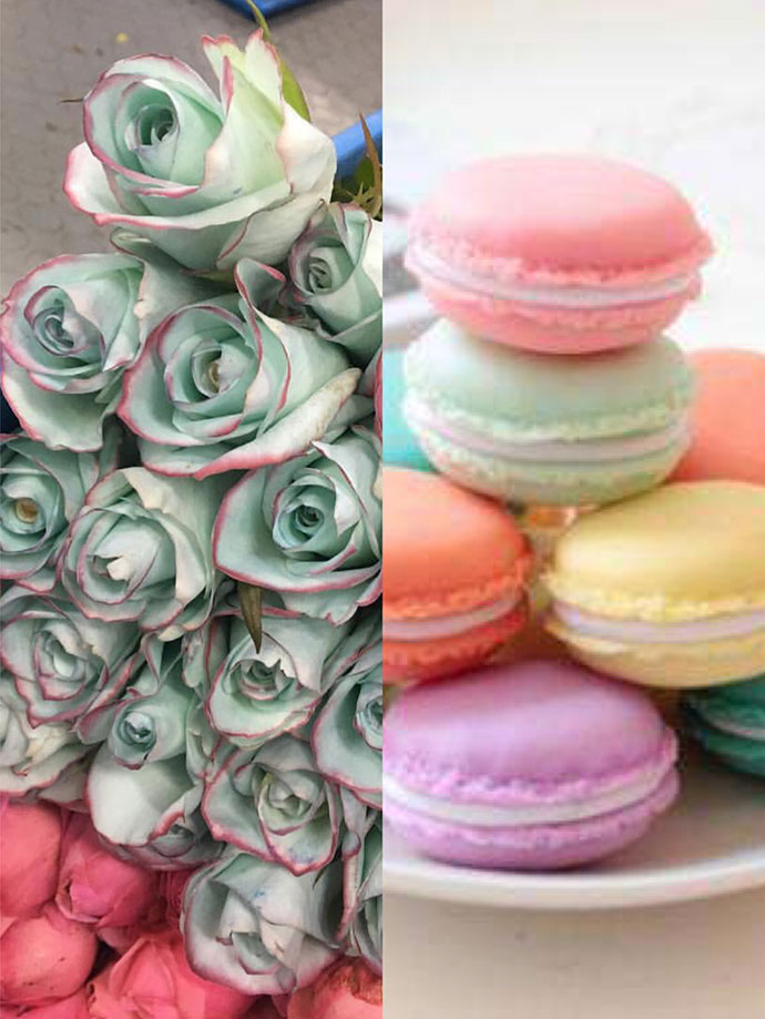 给大家一张马卡龙灵感图去转化一下玫瑰薄荷的色彩思维,调性小清新,淡色系,典型的马卡龙色,可以围绕主题构思,控制色彩比例、饱和度和明暗度等等,结合冷暖色调也是不错的选择,有了方法,根本不用担心脑筋短路。