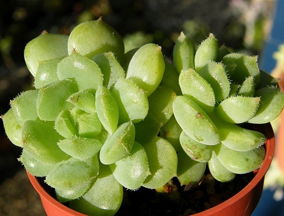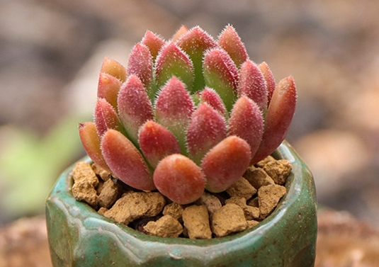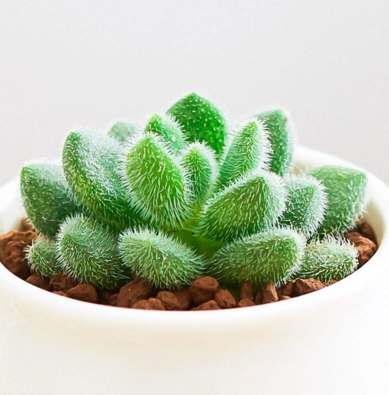 谐音“心动你”,可爱萌萌哒外形非常招人喜爱,也是我的最爱多肉之一。原产墨西哥,高山性,对高温多湿抵抗力弱。肉质叶棍棒状几乎垂直生长,但在光线不足时会横卧并排列稀松。叶色淡绿,基部稍呈红色,看起来软软QQ的,又长了细毛,就像细糖颗粒一般,很像乖乖桶里的绿色水果软糖,又毛茸茸的就像个小肉蹼,小巧精致可爱,足够令你心动。花朵大而艳性,白色花瓣,花蕊顶端呈艳红色。