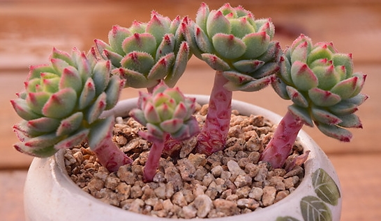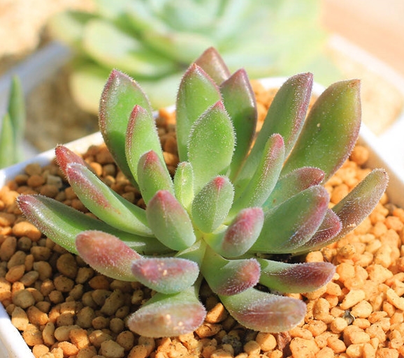 也叫碧丽。叶片卵形、较厚,叶密布细毛,叶正面平整,叶背略圆弧状凸起,叶前端渐尖,叶尖、叶前端叶缘易变红,叶绿色。红唇出状态,植株包裹,叶片肥厚,叶前端大红,随着生长,颜色会出现些许渐变色的变化。