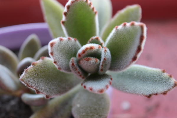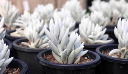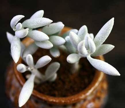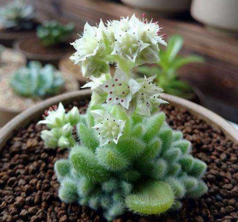 属于兔耳系列多肉。和其他兔耳一样,千兔耳叶子表面也是有一层软绒毛,摸起来很有手感,千兔耳的美,除了它的毛毛叶外,还有那非常对称整齐的对生叶,锯齿状的叶,有点萌萌白枫叶的即视感,整体跟人一种毛绒绒的可爱感。枝干易木质化,可通过断水来塑型。会开花,小白花,从抽生花梗到花朵全开完经历的时间可以多达几个月,可开粉红色的花。