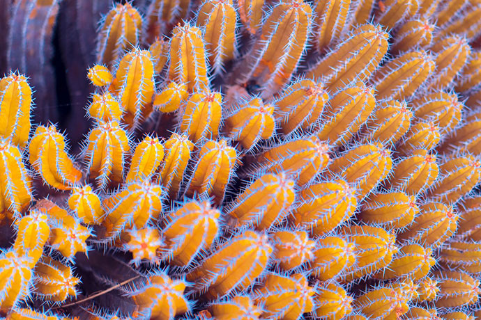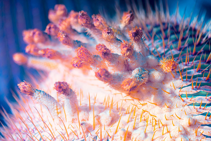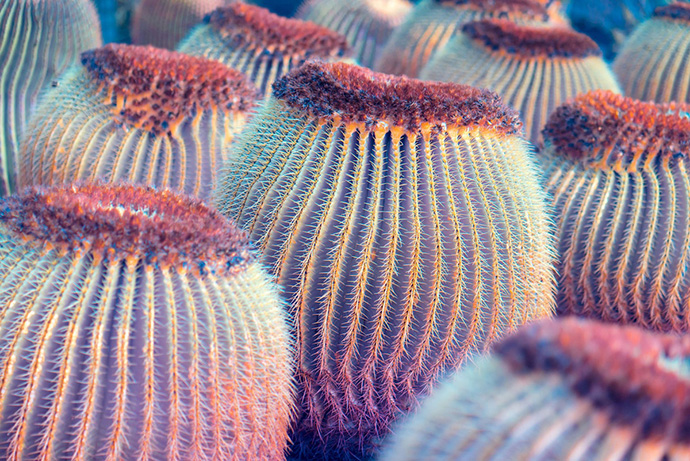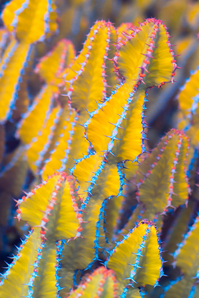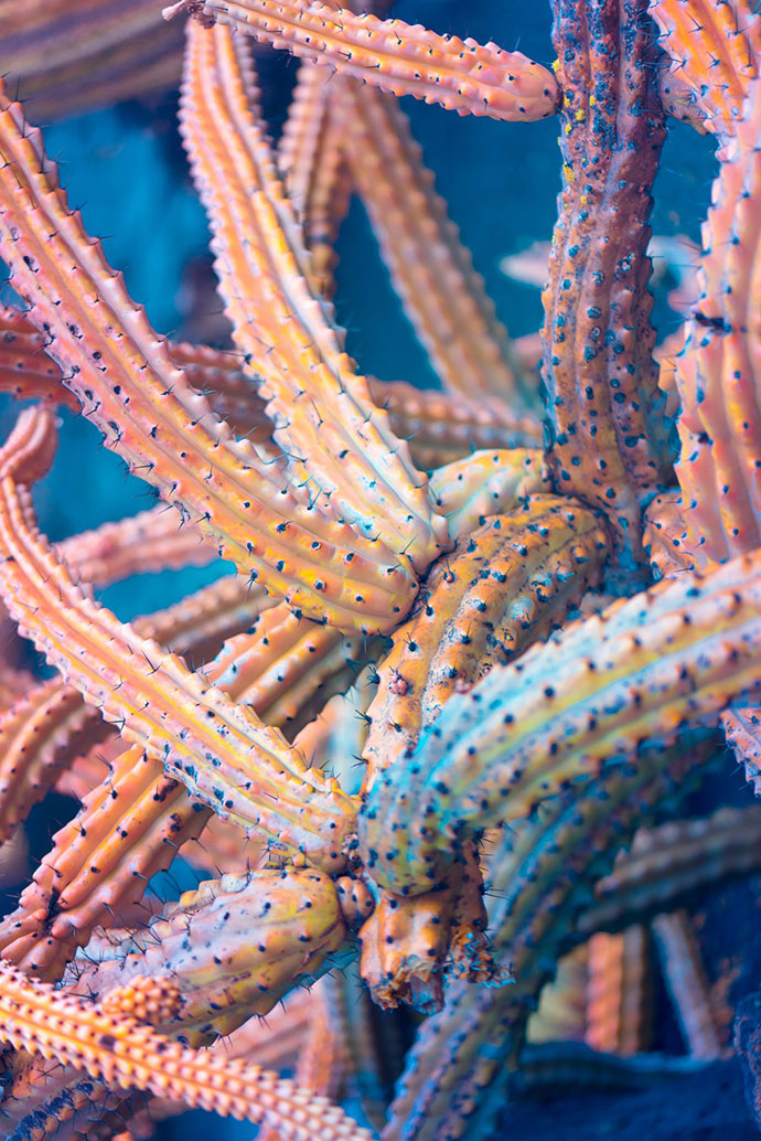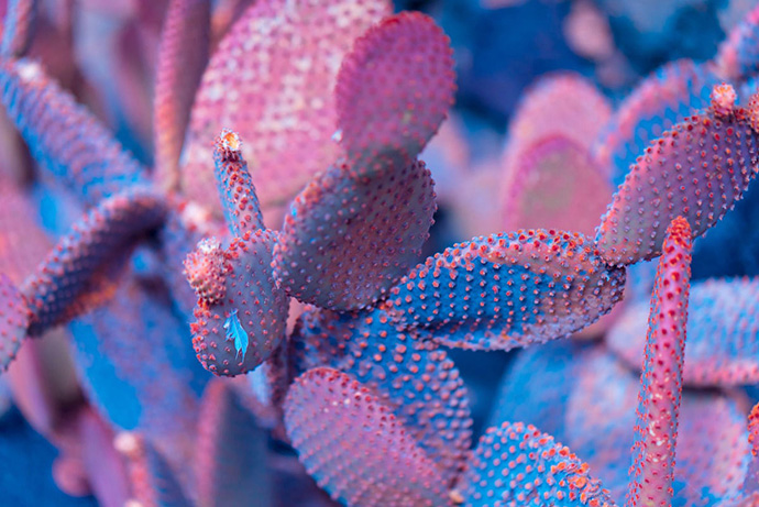 这组作品名为Suprachromacy,出自伦敦FIELD工作室的创意总监Markus Wendt,他使用红外摄影技术拍摄了西班牙兰萨罗特岛(Lanzarote)的各种植物,兰萨罗特岛是西班牙著名的旅游胜地,这里是一个火山岛,火山灰几乎覆盖了全岛,最主要的绿色植物就是耐干旱的棕榈树和仙人掌类的多肉植物。