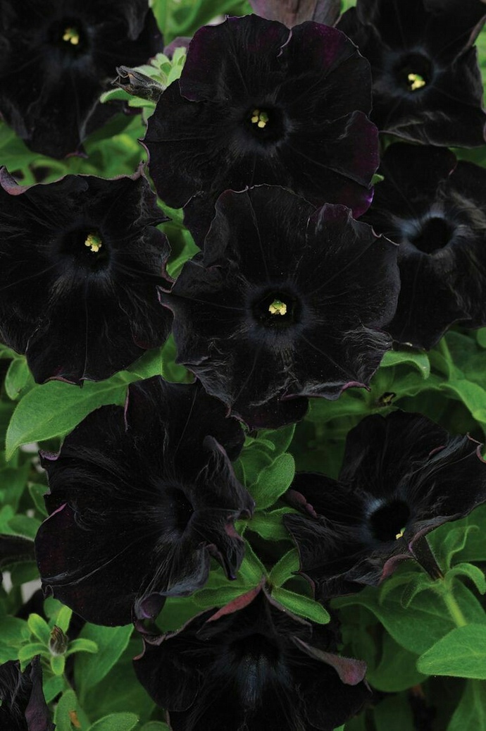 矮牵牛黑丝绒(Black Velvet)上图中黑色矮牵牛旁边的观叶植物是秋海棠属的黑色牙齿(Black Fang),叶片形状非常奇特,有点像逗号,也像动物的牙齿。还有一种黑叶银边的品种,观赏价值极高。
