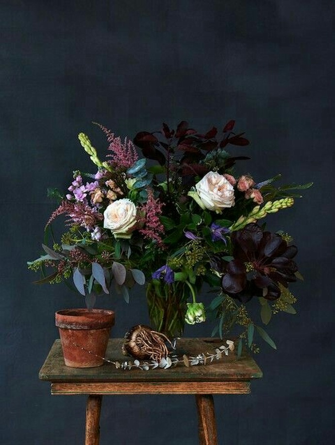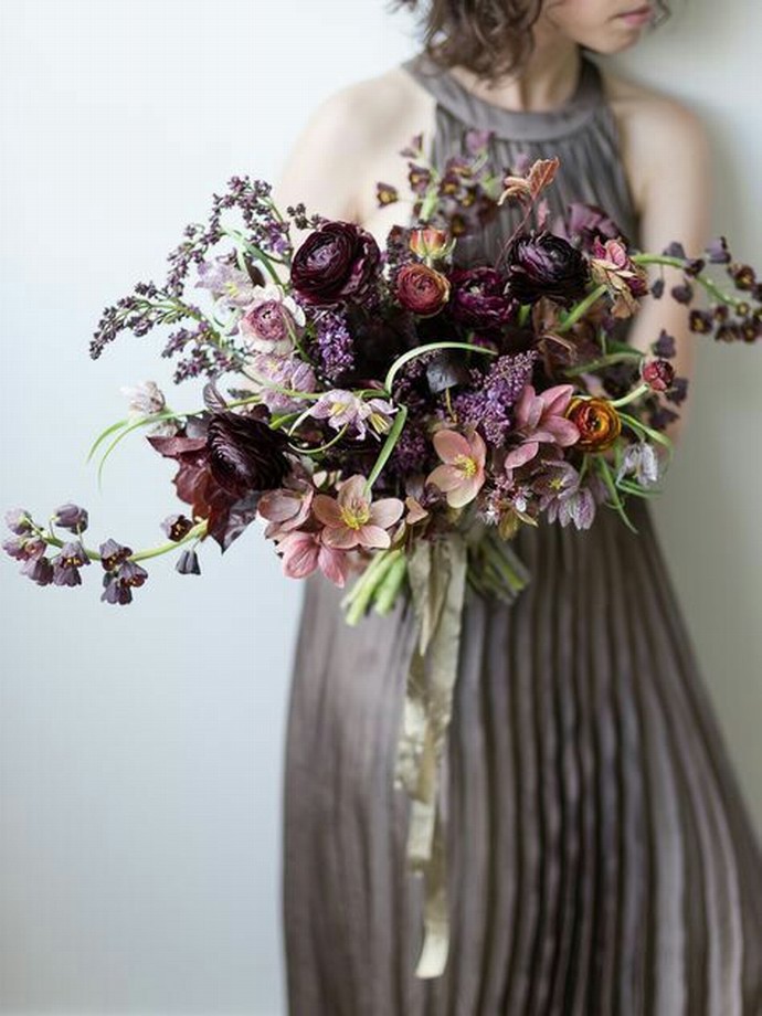 暗色系插花作品赏析,如果喜欢这种女王范,不妨在家中或者婚礼上用一束暗色的花,尽显霸气。