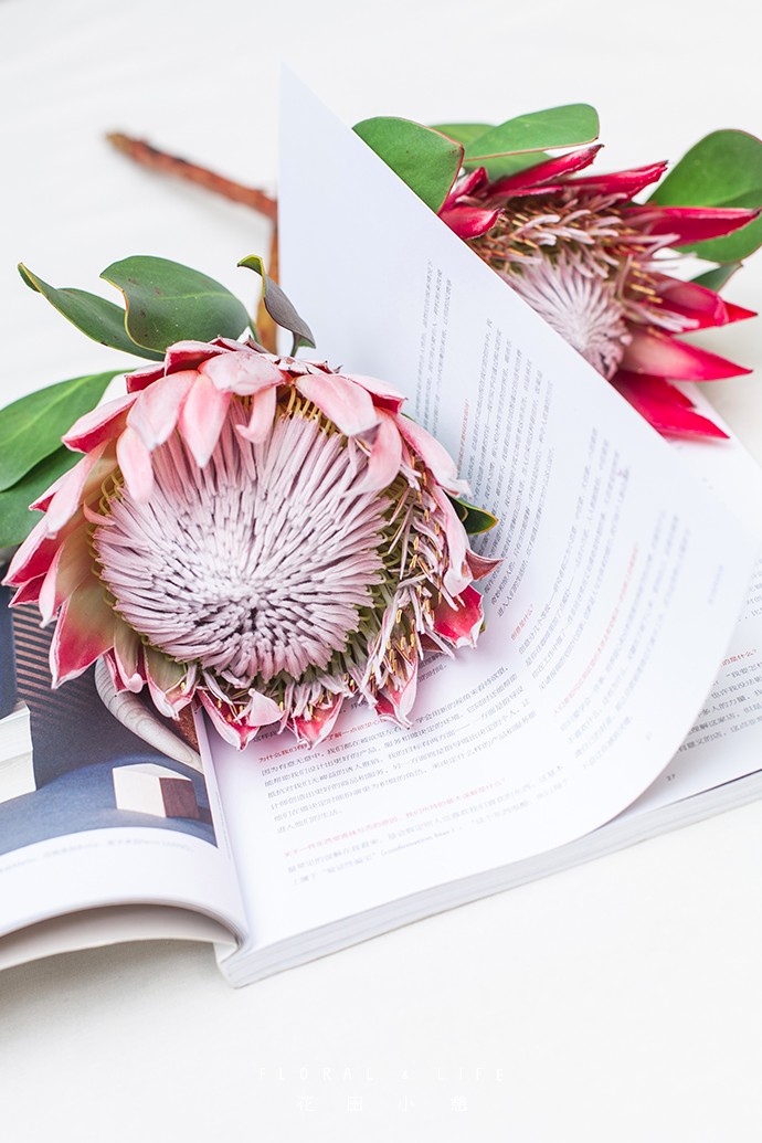 红色和粉色的帝王花进行搭配,独有一种恬静生活才有的温暖色泽。放置于白色的书籍一侧进行拍摄,