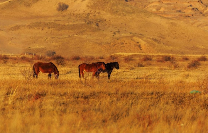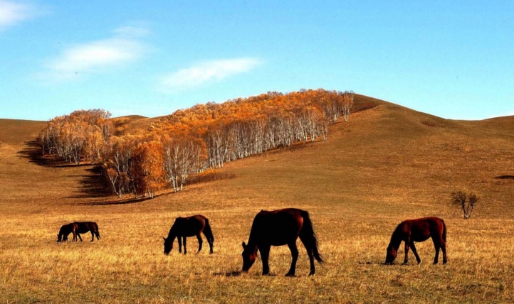 深秋的草原,草早已褪去了满富生机的绿油油,换上了这迷人的大地色,广阔的天地之间,大地和蓝蓝的天空颜色对比可谓强烈,实在是美丽而不失壮阔。
