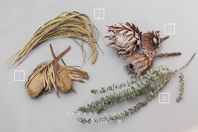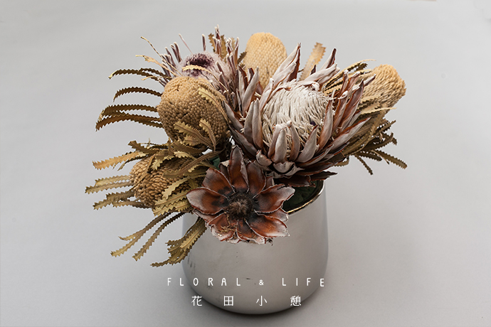 1.干燥花有着独特的质感,以多彩的搭配展现出曼妙的风情. 帝王花与女王花聚于中心,通过尤加利和谷子“流线型”样式呈现出优美的线条,表现出简约自然的气质。