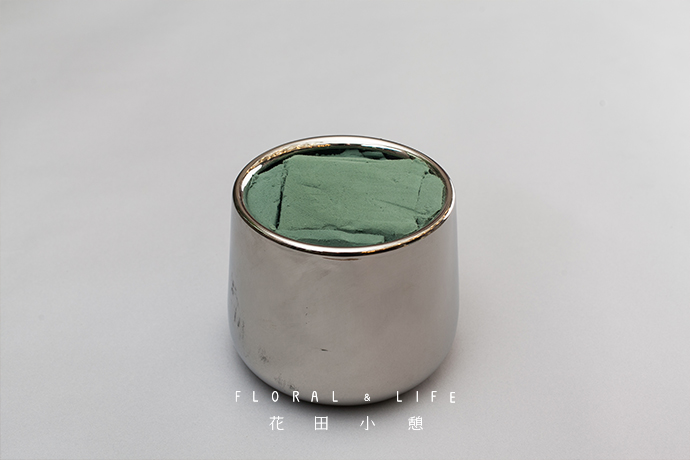根据作品的整体配色,选择一款带有金属质感的花器,同时将花泥处理成可放置于容器内
