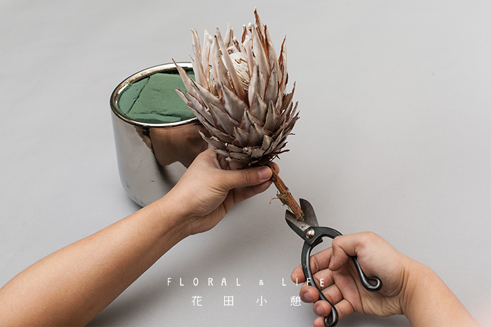 精选一支花型饱满、干燥自然的帝王花作为主花材。根据作品所需的长度,将花枝根部斜切45度时,同时避免损坏植物的原有形状。