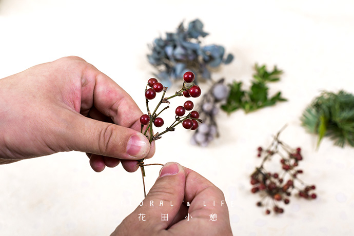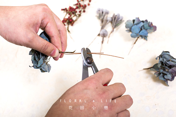 将准备好的花材裁剪成合适大小并进行分类,然后用细铁丝缠绕1-2枝即可。