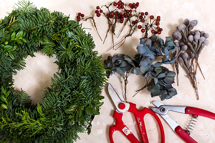 - 作品配色 -1.本次作品中,通过简单的花材搭配,呈现出简单的新古典装饰性花边线条。同时以红色的山归来和淡蓝色绣球作为环形花饰,上下局部装点其间,仿佛在圣诞的夜晚,也可以听见自己幸福浪漫的心情。