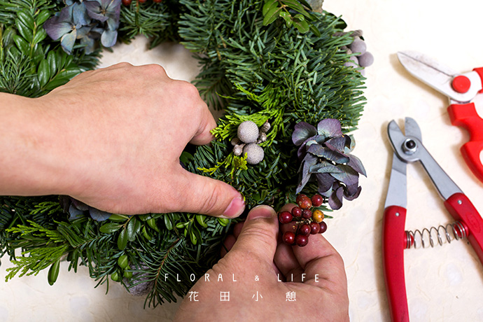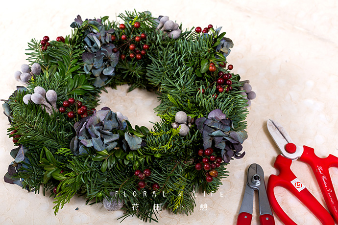 1.本次作品中,通过简单的花材搭配,呈现出简单的新古典装饰性花边线条。同时以红色的山归来和淡蓝色绣球作为环形花饰,上下局部装点其间,仿佛在圣诞的夜晚,也可以听见自己幸福浪漫的心情。