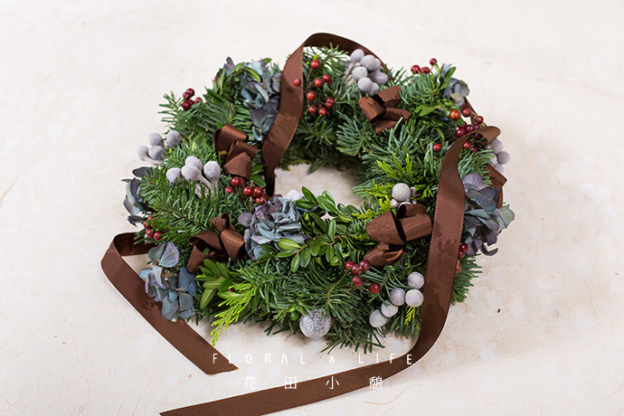 最后将深色丝带系成精致蝴蝶结穿插于花环中,也给寒冷的冬季添加了温暖的想象,作品完成!