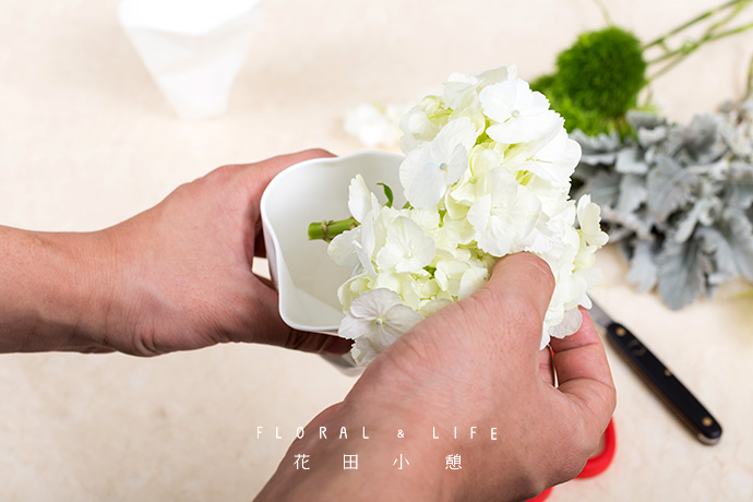 将准备好的绣球花处理成可以放入容器的尺寸。