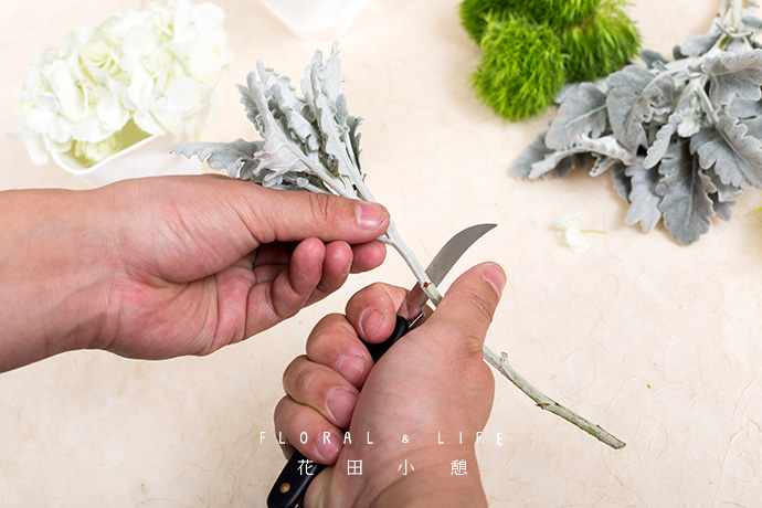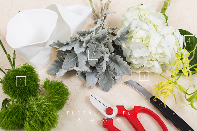 为了方便大家在花材搭配时的选择,花田小憩特设香味等级图谱,供大家在学习过程中了解更多植物的属性,以方便作品选择更适合的空间位置陈列。将准备好的绣球花处理成可以放入容器的尺寸。