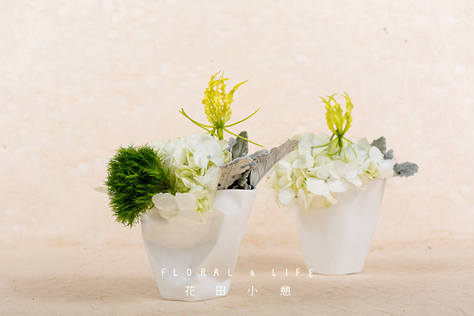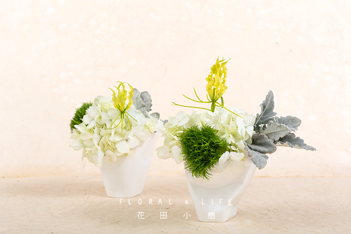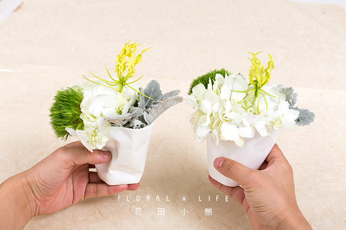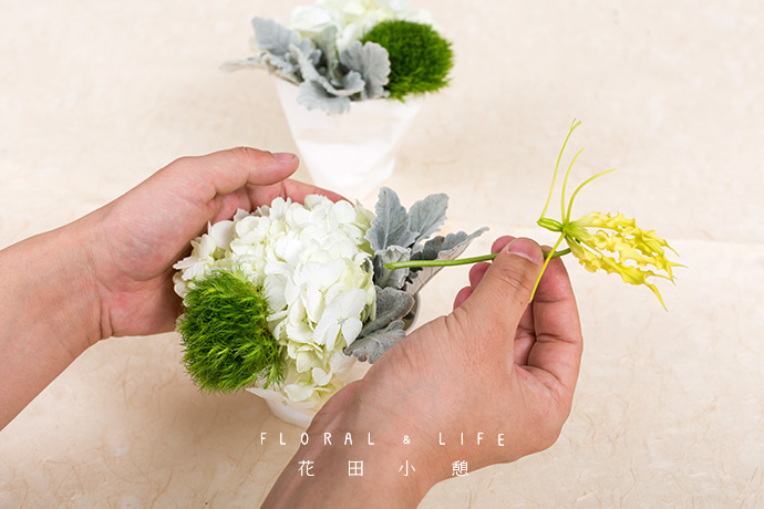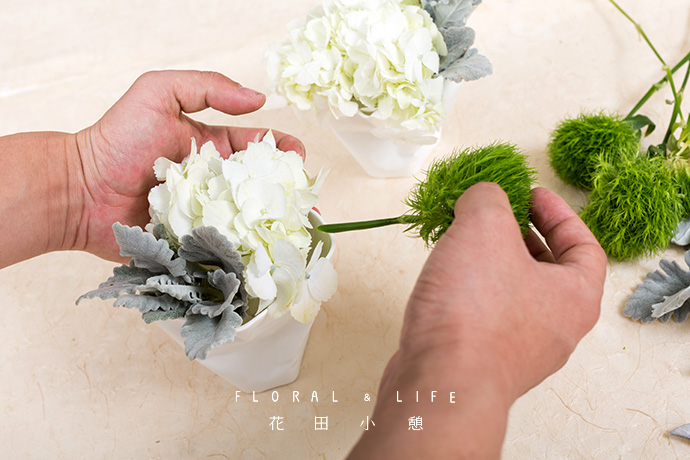 在作品的侧面补入石竹球,也可以换成同等大小的绿色植株进行搭配。