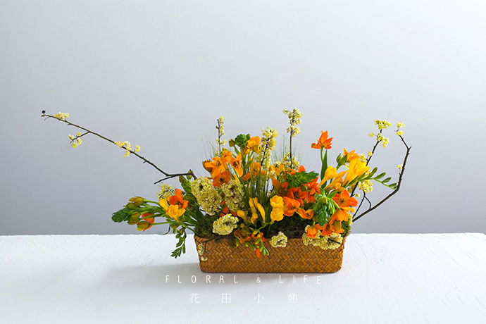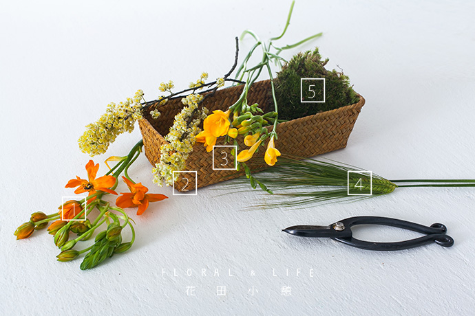 - 作品配色 -1.本次作品中,以黄色的花材作为基准色彩,通过香雪兰和灯台花的明亮质感,给人轻快、活力的印象. 将绿色的苔藓和小麦进行搭配调和,营造出春天与原野的自然效果。