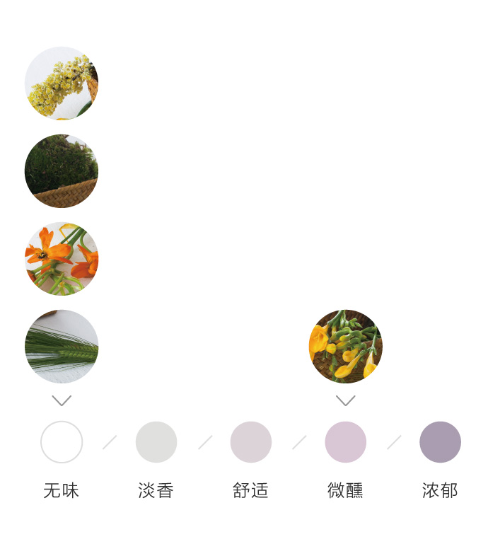 为了方便大家在花材搭配时的选择,花田小憩特设香味等级图谱,供大家在学习过程中了解更多植物的属性,以方便作品选择更适合的空间位置陈列。