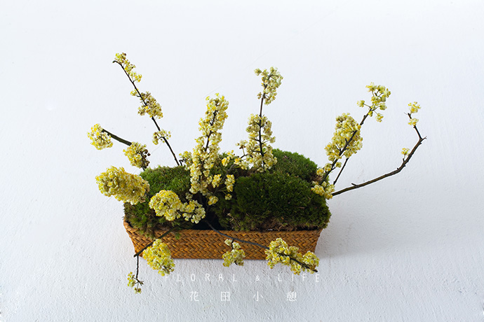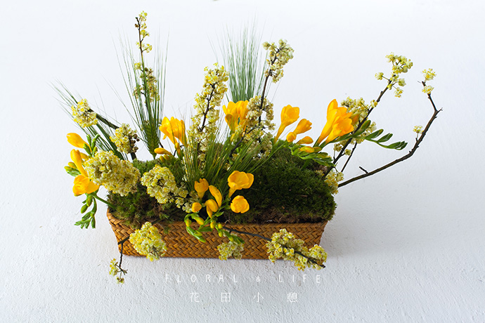 1.本次作品中,以黄色的花材作为基准色彩,通过香雪兰和灯台花的明亮质感,给人轻快、活力的印象. 将绿色的苔藓和小麦进行搭配调和,营造出春天与原野的自然效果。