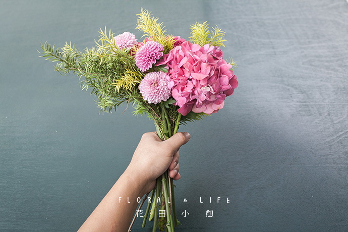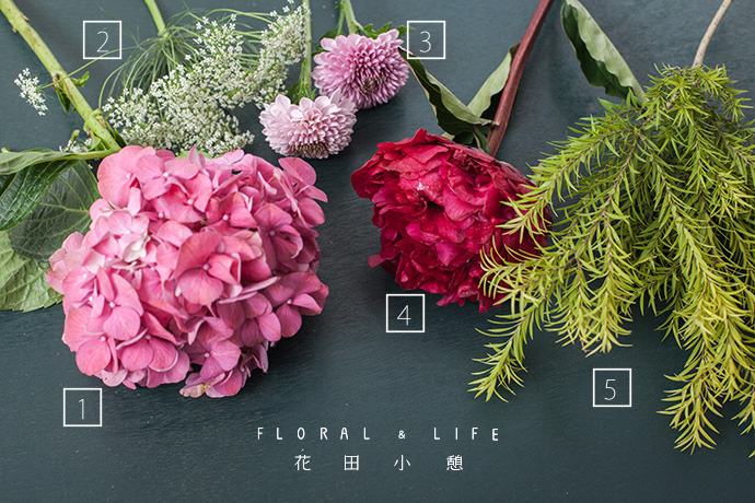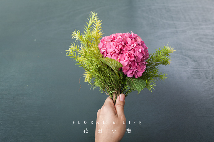 为了方便大家在花材搭配时的选择,花田小憩特设香味等级图谱,供大家在学习过程中了解更多植物的属性,以方便作品选择更适合的空间位置陈列。精选一朵质地饱满且颜色鲜艳的粉色绣球花,作为主要花材。