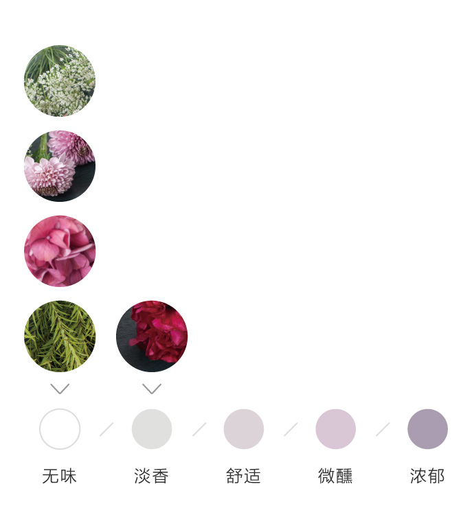 为了方便大家在花材搭配时的选择,花田小憩特设香味等级图谱,供大家在学习过程中了解更多植物的属性,以方便作品选择更适合的空间位置陈列。
