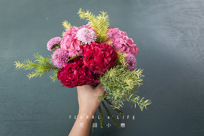 1.本次作品,粉色的绣球花像穿暖回归的大地,总是能成为视觉的焦点. 绿色的松枝、鲜红的芍药、圆润的乒乓菊,抢眼的将对于季节的感受表现出来,彰显春日依旧是如此丰富多彩。